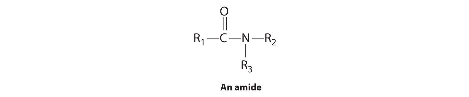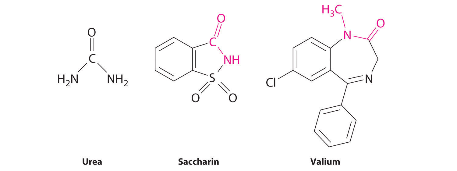 The lone pair of electrons on the nitrogen atom of an amide can participate in π bonding with the carbonyl group, thus reducing the reactivity of the amide (Figure 24.19 "The Electronic Structure of an Amide") and inhibiting free rotation about the C–N bond. Amides are therefore the least reactive of the carboxylic acid derivatives. The stability of the amide bond is crucially important in biology because amide bonds form the backbones of peptides and proteins. (For more information on peptides and proteins, see Chapter 12 "Solids", Section 12.8 "Polymeric Solids".) The amide bond is also found in many other biologically active and commercially important molecules, including penicillin; urea, which is used as fertilizer; saccharin, a sugar substitute; and valium, a potent tranquilizer. (For more information on the structure of penicillin, see Chapter 3 "Chemical Reactions", Section 3.2 "Determining Empirical and Molecular Formulas".)