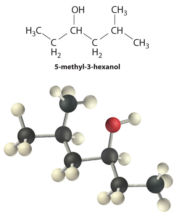 Alcohols are usually prepared by adding water across a carbon–carbon double bond or by a nucleophilic substitution reaction of an alkyl halide using hydroxide, a potent nucleophile (Figure 24.12). As you will see in Section 24.6 "The Molecules of Life", alcohols can also be prepared by reducing compounds that contain the carbonyl functional group (C=O; part (a) in Figure 24.14 "The Oxidation State of Carbon in Oxygen- and Nitrogen-Containing Functional Groups"). Alcohols are classified as primary, secondary, or tertiary, depending on whether the –OH group is bonded to a primary, secondary, or tertiary carbon. For example, the compound 5-methyl-3-hexanol is a secondary alcohol.