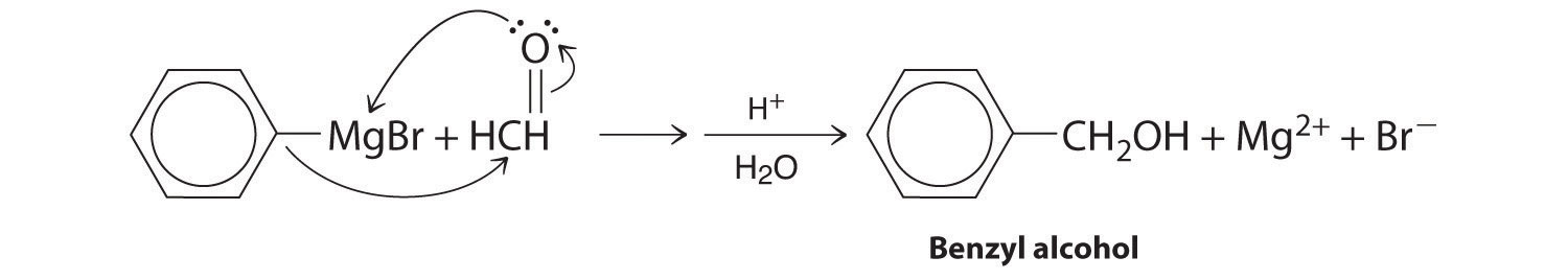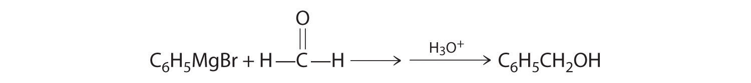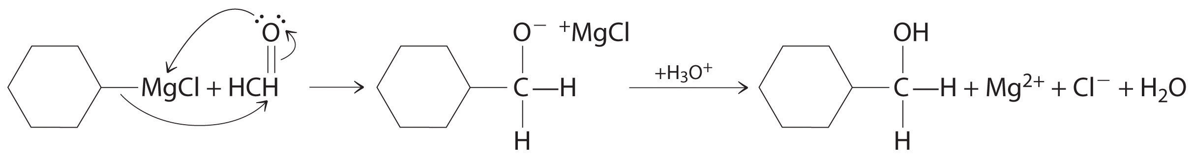 Aldehydes and ketones react with many organometallic compounds that contain stabilized carbanions. One of the most important classes of such compounds are the Grignard reagentsAn organometallic compound that has stabilized carbanions, whose general formula is RMgX, where X is Cl, Br, or I., organomagnesium compounds with the formula RMgX (X is Cl, Br, or I) that are so strongly polarized that they can be viewed as containing R− and MgX+. These reagents are named for the French chemist Victor Grignard (1871–1935), who won a Nobel Prize in Chemistry in 1912 for their development. In a Grignard reaction, the carbonyl functional group is converted to an alcohol, and the carbon chain of the carbonyl compound is lengthened by the addition of the R group from the Grignard reagent. One example is reacting cyclohexylmagnesium chloride, a Grignard reagent, with formaldehyde: