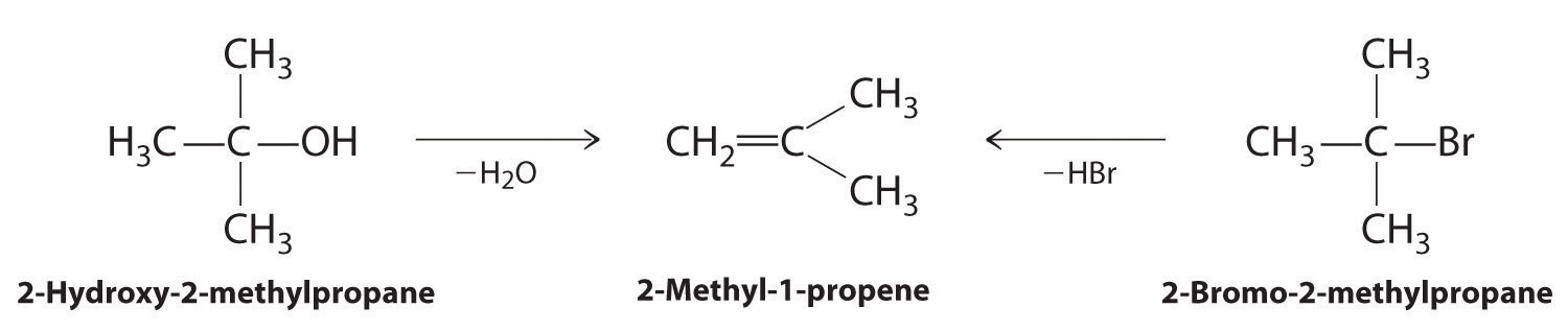 Alkenes and alkynes are most often prepared by elimination reactions (Figure 24.13). A typical example is the preparation of 2-methyl-1-propene, whose derivative, 3-chloro-2-methyl-1-propene, is used as a fumigant and insecticide. The parent compound can be prepared from either 2-hydroxy-2-methylpropane or 2-bromo-2-methylpropane: