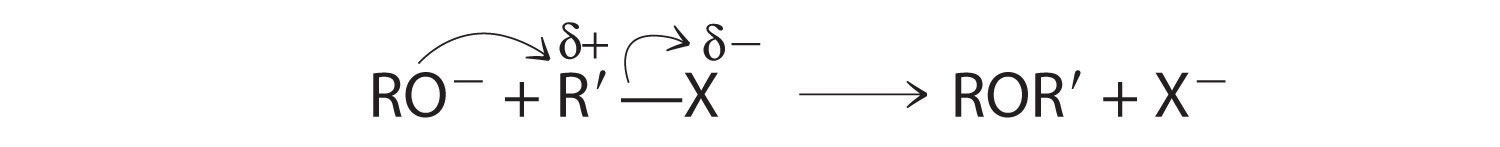 Ethers, especially those with two different alkyl groups (ROR′), can be prepared by a substitution reaction in which a nucleophilic alkoxide ion (RO−) attacks the partially positively charged carbon atom of the polar C–X bond of an alkyl halide (R′X):