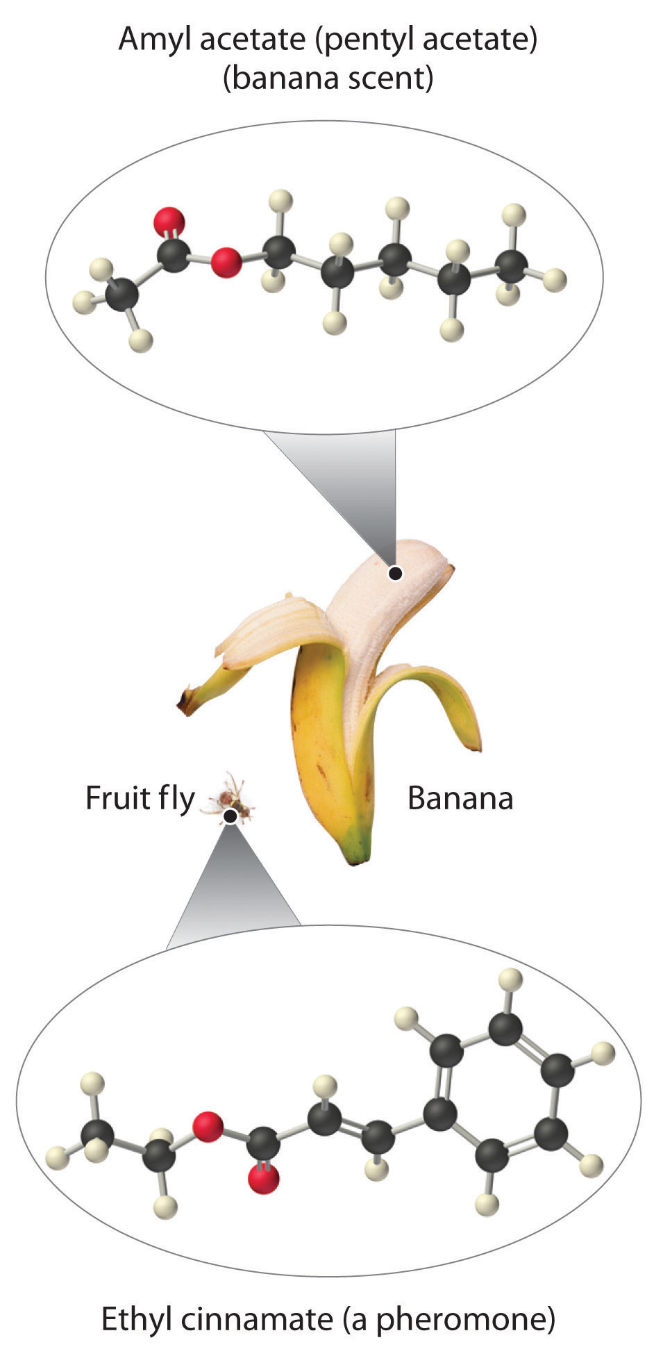 As stated earlier, esters are familiar to most of us as fragrances, such as banana and pineapple. Other esters with intense aromas function as sex attractants, or pheromones, such as the pheromone from the oriental fruit fly. Research on using synthetic insect pheromones as a safer alternative to insecticides for controlling insect populations, such as cockroaches, is a rapidly growing field in organic chemistry.
