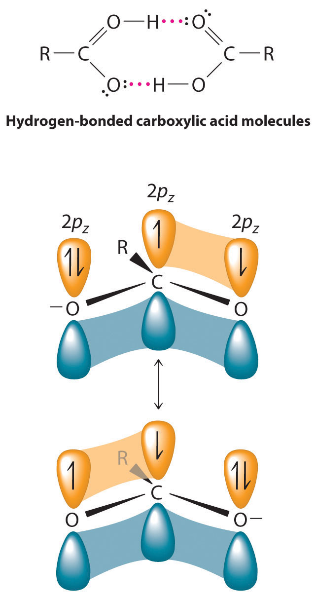 Compounds that contain the carboxyl functional group are acidic because carboxylic acids can easily lose a proton: the negative charge in the carboxylate ion (RCO2−) is stabilized by delocalization of the π electrons: