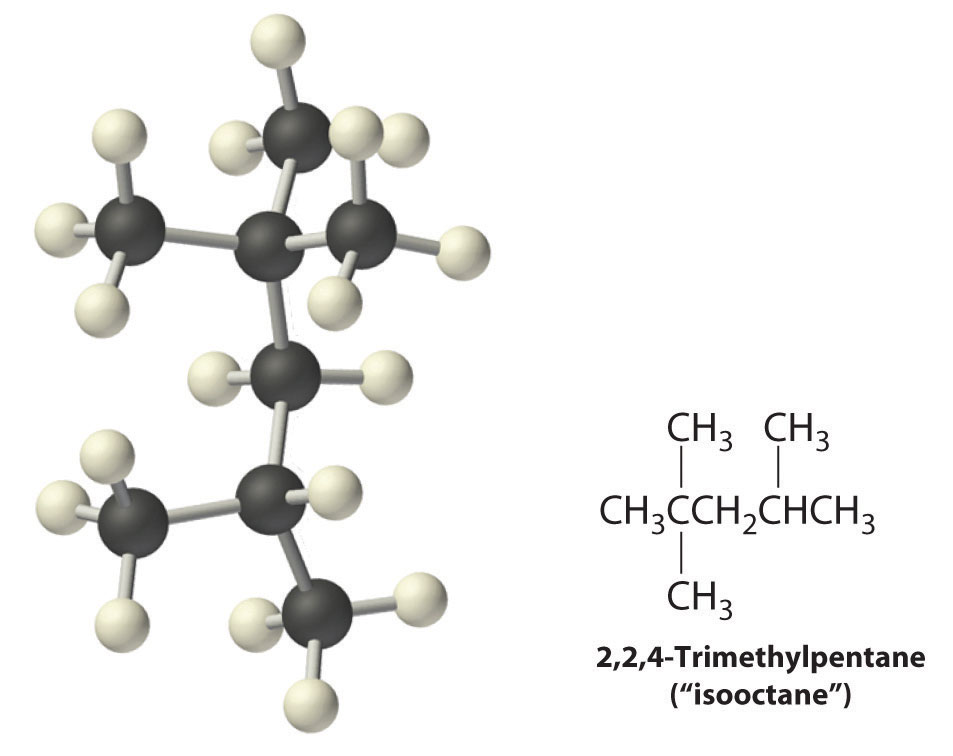 Radicals are also produced during the combustion of alkanes, with CO2 and H2O as the final products. As discussed in Section 24.3 "Reactivity of Organic Molecules", radicals are stabilized by the presence of multiple carbon substituents that can donate electron density to the electron-deficient carbon. The chemical explanation of octane ratings, as described in Chapter 2 "Molecules, Ions, and Chemical Formulas", Section 2.6 "Industrially Important Chemicals", rests partly on the stability of radicals produced from the different hydrocarbon fuels. Recall that n-heptane, which does not burn smoothly, has an octane rating of 0, and 2,2,4-trimethylpentane (“isooctane”), which burns quite smoothly, has a rating of 100 (Figure 2.25 "The Octane Ratings of Some Hydrocarbons and Common Additives"). Isooctane has a branched structure and is capable of forming tertiary radicals that are comparatively stable.