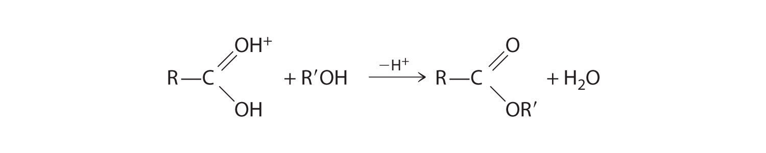 Esters have the general formula RCO2R′, where R and R′ can be virtually any alkyl or aryl group. Esters are often prepared by reacting an alcohol (R′OH) with a carboxylic acid (RCO2H) in the presence of a catalytic amount of strong acid. (For more information on esters and catalysts, see Chapter 3 "Chemical Reactions", Section 3.5 "Classifying Chemical Reactions".) The purpose of the acid (an electrophile) is to protonate the doubly bonded oxygen atom of the carboxylic acid (a nucleophile) to give a species that is more electrophilic than the parent carboxylic acid.