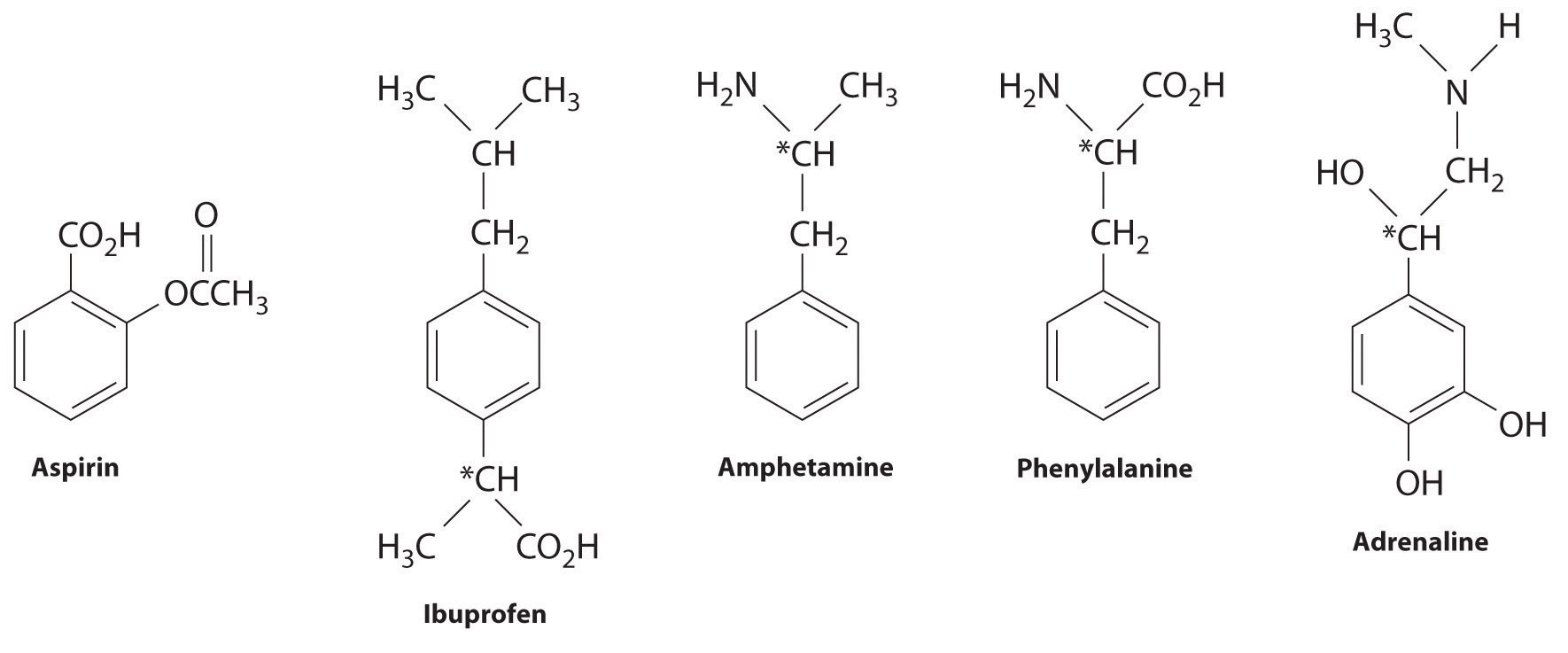 Aspirin (antifever activity), ibuprofen (antifever and anti-inflammatory activity), and amphetamine (stimulant) have pharmacological effects. Phenylalanine is an amino acid. Adrenaline is a hormone that elicits the “fight or flight” response to stress. Chiral centers are indicated with an asterisk.