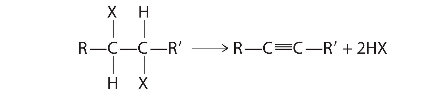 The reaction on the left proceeds by eliminating the elements of water (H+ plus OH−), so it is a dehydration reactionA reaction that proceeds by eliminating the elements of water . If an alkane contains two properly located functional groups, such as –OH or –X, both of them may be removed as H2O or HX with the formation of a carbon–carbon triple bond: