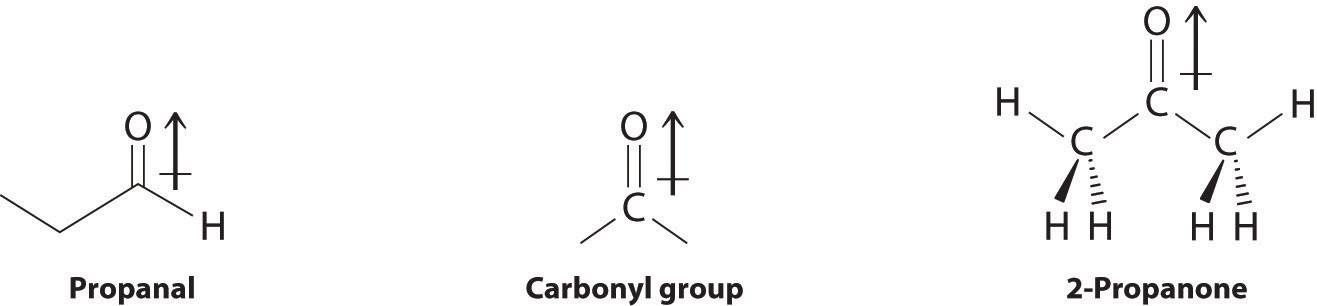 Aldehydes and ketones contain the carbonyl functional group, which has an appreciable dipole moment because of the polar C=O bond. The presence of the carbonyl group results in strong intermolecular interactions that cause aldehydes and ketones to have higher boiling points than alkanes or alkenes of comparable molecular mass (Table 24.3 "Boiling Points of Alkanes, Aldehydes, and Ketones of Comparable Molecular Mass"). As the mass of the molecule increases, the carbonyl group becomes less important to the overall properties of the compound, and the boiling points approach those of the corresponding alkanes.
