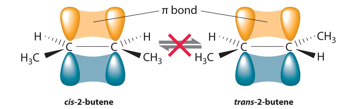 In butane, there is only a small energy barrier to rotation about the C2–C3 σ bond. In the formation of cis- or trans-2-butene from butane, the p orbitals on C2 and C3 overlap to form a π bond. To convert cis-2-butene to trans-2-butene or vice versa through rotation about the double bond, the π bond must be broken. Because this interconversion is energetically unfavorable, cis and trans isomers are distinct compounds that generally have different physical and chemical properties.
