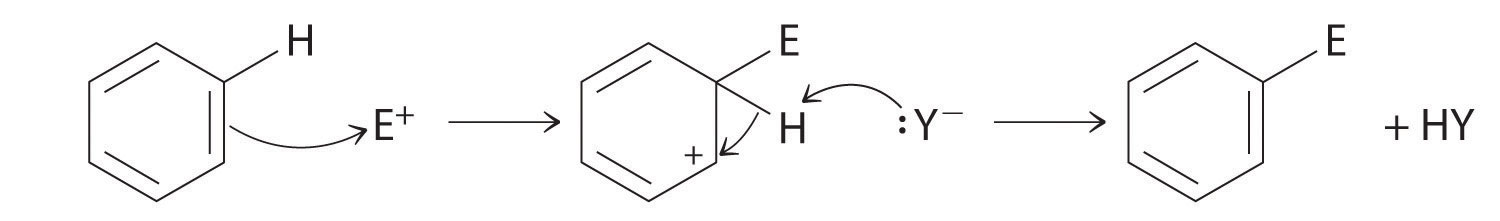 Although arenes are usually drawn with three C=C bonds, benzene is about 150 kJ/mol more stable than would be expected if it contained three double bonds. This increased stability is due to the delocalization of the π electron density over all the atoms of the ring. (For more information on delocalization, see Chapter 9 "Molecular Geometry and Covalent Bonding Models", Section 9.3 "Delocalized Bonding and Molecular Orbitals".) Compared with alkenes, arenes are poor nucleophiles. Consequently, they do not undergo addition reactions like alkenes; instead, they undergo a variety of electrophilic aromatic substitution reactionsA reaction in which a −H of an arene is replaced (substituted) by an electrophilic group in a two-step process. that involve the replacement of –H on the arene by a group –E, such as –NO2, –SO3H, a halogen, or an alkyl group, in a two-step process. The first step involves addition of the electrophile (E) to the π system of benzene, forming a carbocation. In the second step, a proton is lost from the adjacent carbon on the ring: