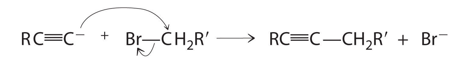 Alkynes in which the triple bond is located at one end of a carbon chain are called terminal alkynes and contain a hydrogen atom attached directly to a triply bonded carbon: R–C≡C–H. Terminal alkynes are unusual in that the hydrogen atom can be removed relatively easily as H+, forming an acetylide ion (R–C≡C−). Acetylide ions are potent nucleophiles that are especially useful reactants for making longer carbon chains by a nucleophilic substitution reaction. As in earlier examples of such reactions, the nucleophile attacks the partially positively charged atom in a polar bond, which in the following reaction is the carbon of the Br–C bond:
