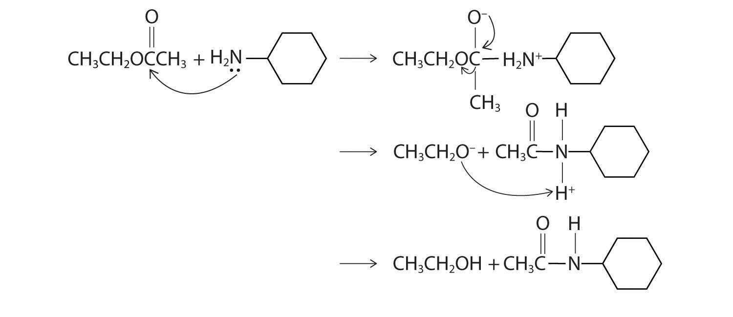 Et3N:(l) + HCl(aq) → Et3NH+Cl−(aq)which gives triethylammonium chloride. Amines can react with virtually any electrophile, including the carbonyl carbon of an aldehyde, a ketone, or an ester. Aryl amines such as aniline (C6H5NH2) are much weaker bases than alkylamines because the lone pair of electrons on nitrogen interacts with the π bonds of the aromatic ring, delocalizing the lone pair through resonance (Figure 24.20 "Structures and Basicity of Aniline and Cyclohexylamine").