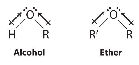 Both alcohols and ethers can be thought of as derivatives of water in which at least one hydrogen atom has been replaced by an organic group, as shown here. Because of the electronegative oxygen atom, the individual O–H bond dipoles in alcohols cannot cancel one another, resulting in a substantial dipole moment that allows alcohols to form hydrogen bonds. Alcohols therefore have significantly higher boiling points than alkanes or alkenes of comparable molecular mass, whereas ethers, without a polar O–H bond, have intermediate boiling points due to the presence of a small dipole moment (Table 24.2 "Boiling Points of Alkanes, Ethers, and Alcohols of Comparable Molecular Mass"). The larger the alkyl group in the molecule, however, the more “alkane-like” the alcohol is in its properties. Because of their polar nature, alcohols and ethers tend to be good solvents for a wide range of organic compounds.