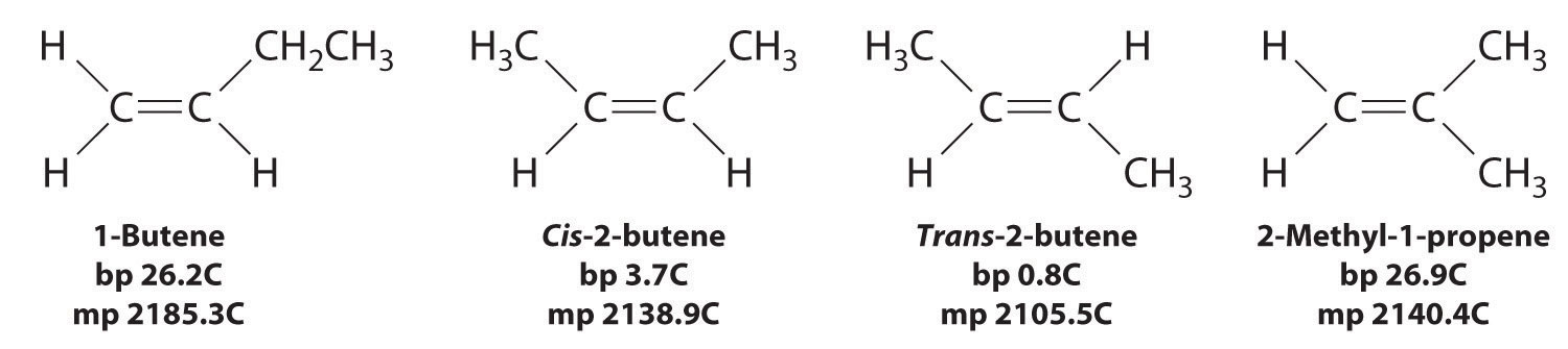 In Section 24.2 "Isomers of Organic Compounds", we explained that rotation about the carbon–carbon multiple bonds of alkenes and alkynes cannot occur without breaking a π bond, which therefore constitutes a large energy barrier to rotation (Figure 24.15 "Carbon–Carbon Bonding in Alkenes and Interconversion of "). Consequently, the cis and trans isomers of alkenes generally behave as distinct compounds with different chemical and physical properties. A four-carbon alkene has four possible isomeric forms: three structural isomers, which differ in their connectivity, plus a pair of geometric isomers from one structural isomer (2-butene). These two geometric isomers are cis-2-butene and trans-2-butene. The four isomers have significantly different physical properties.