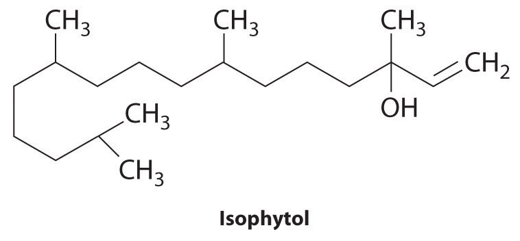 The structure of isophytol is shown here. This compound is used to prepare vitamins E and K. Does isophytol form cis and trans isomers? If so, draw these isomers.