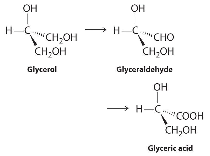 Glycerol (1,2,3-propanetriol, or 1,2,3-trihydroxypropane) is produced from sugars by fermentation. It also is obtained from oils and fats as a by-product during the manufacture of soaps. Glycerol can be converted to glyceric acid by the following sequence: